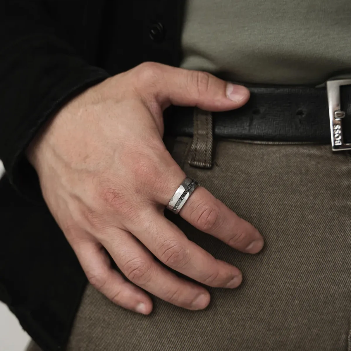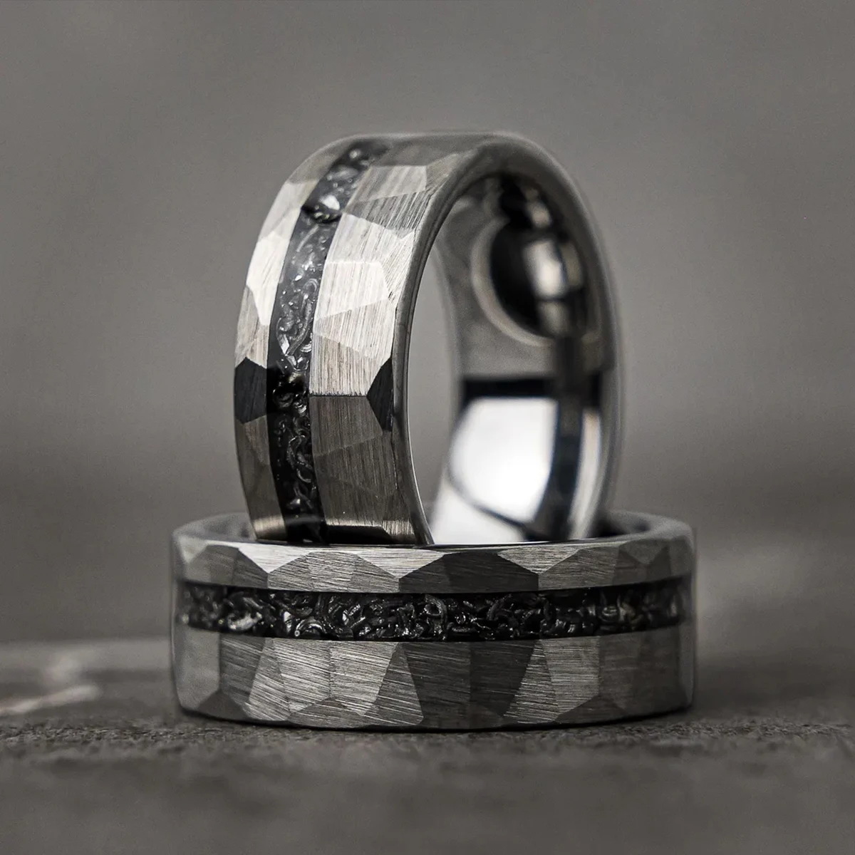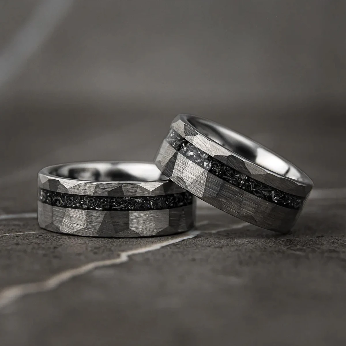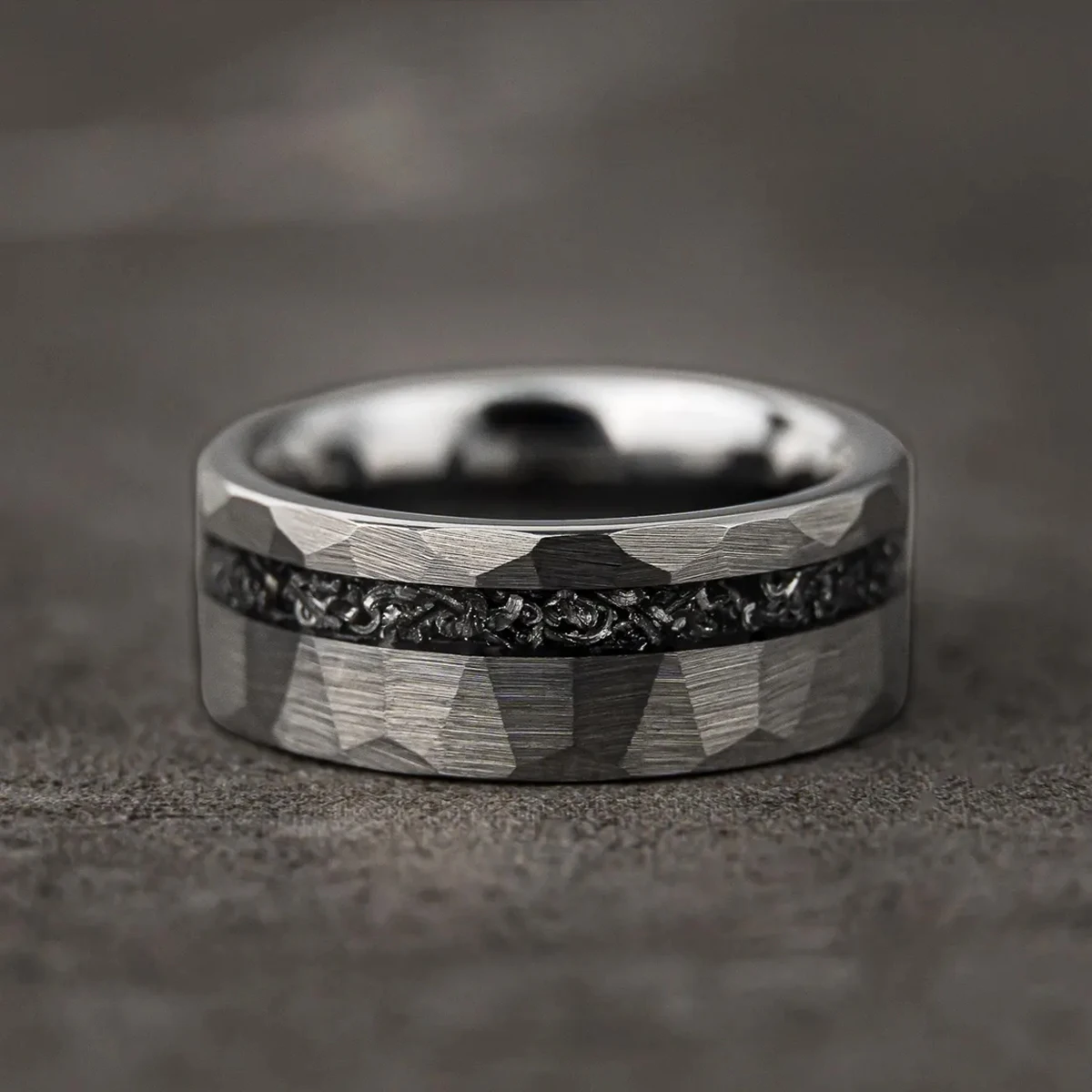 Make a bold statement of love and style with this 8MM silver-colored tungsten carbide ring, designed for modern men who appreciate strength, meaning, and fashion. Featuring a unique meteorite inlay and a stylish hammered ring finish, this piece blends cosmic beauty with rugged elegance—perfect as men’s wedding bands, an engagement ring, or a timeless wedding ring.
