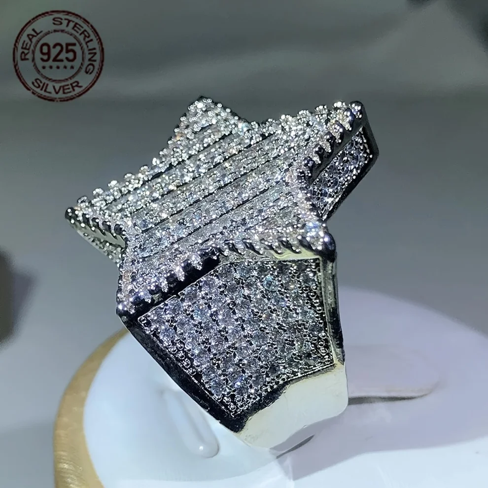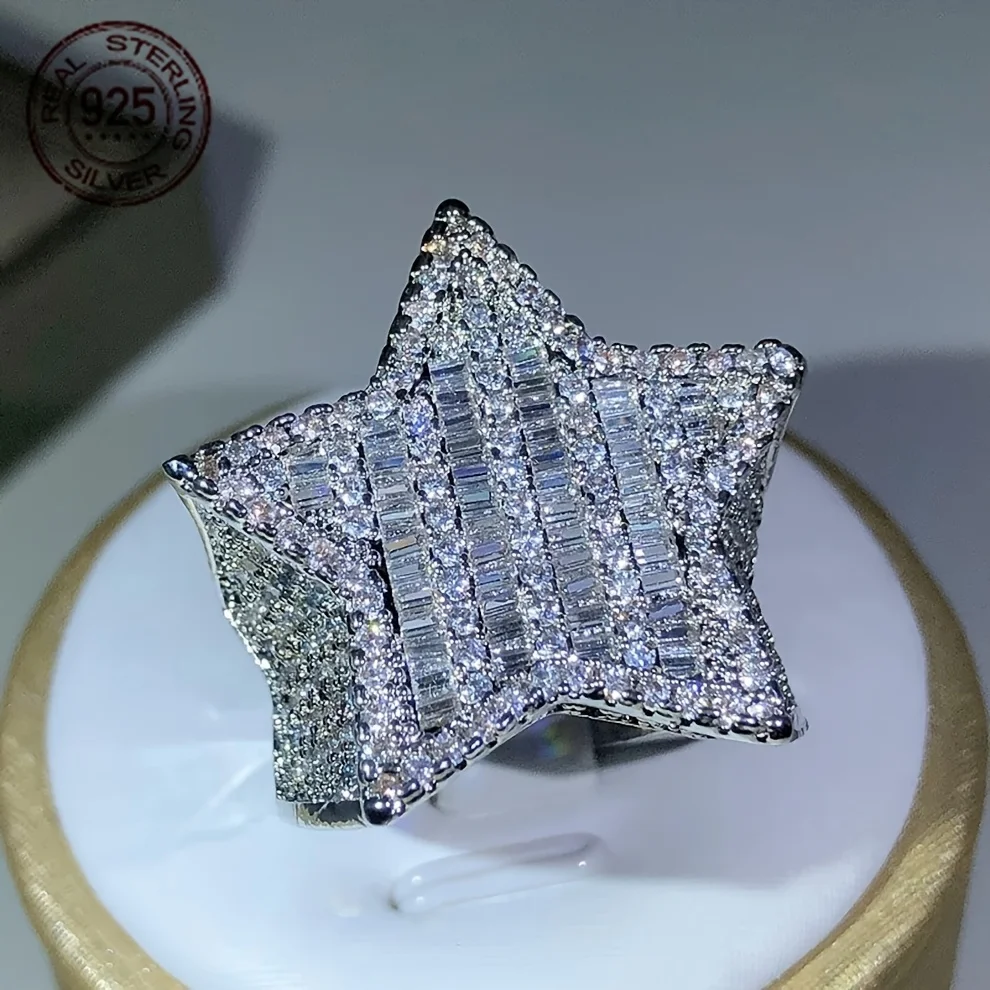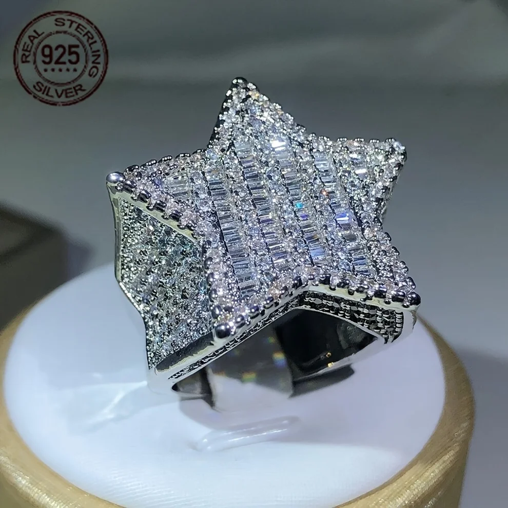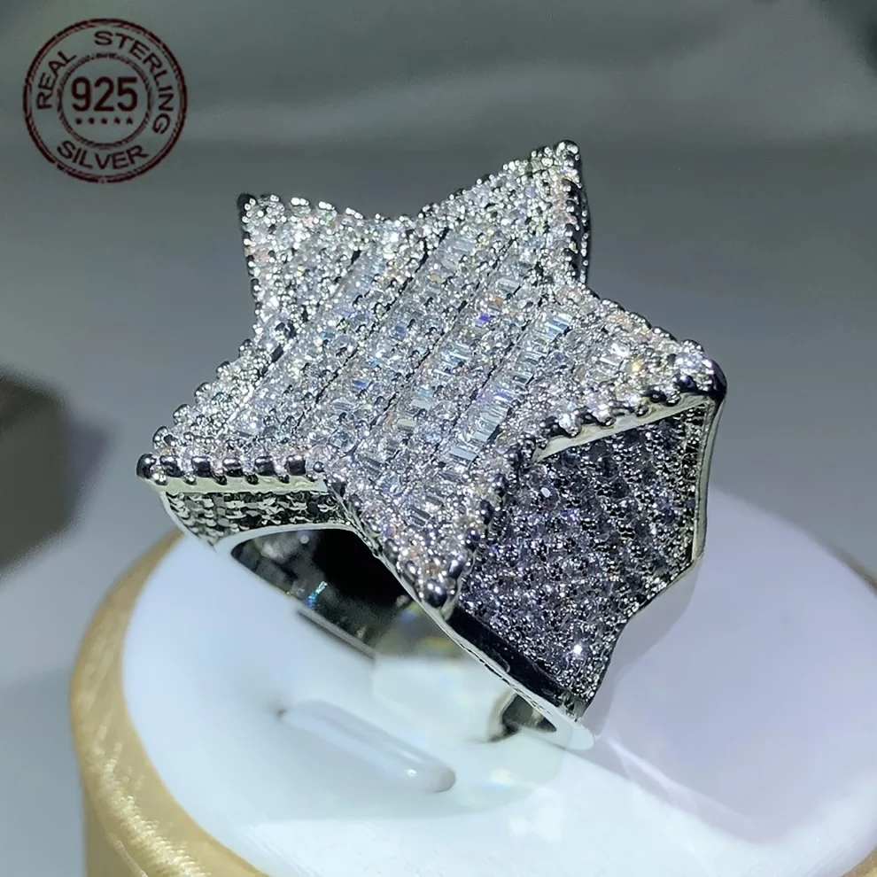Luxury 925 Sterling Silvery Ring Ice Out Sparkling Zircon Rappers HipHop Ring Five Star Shape Rings For Men Exaggerated Jewelry