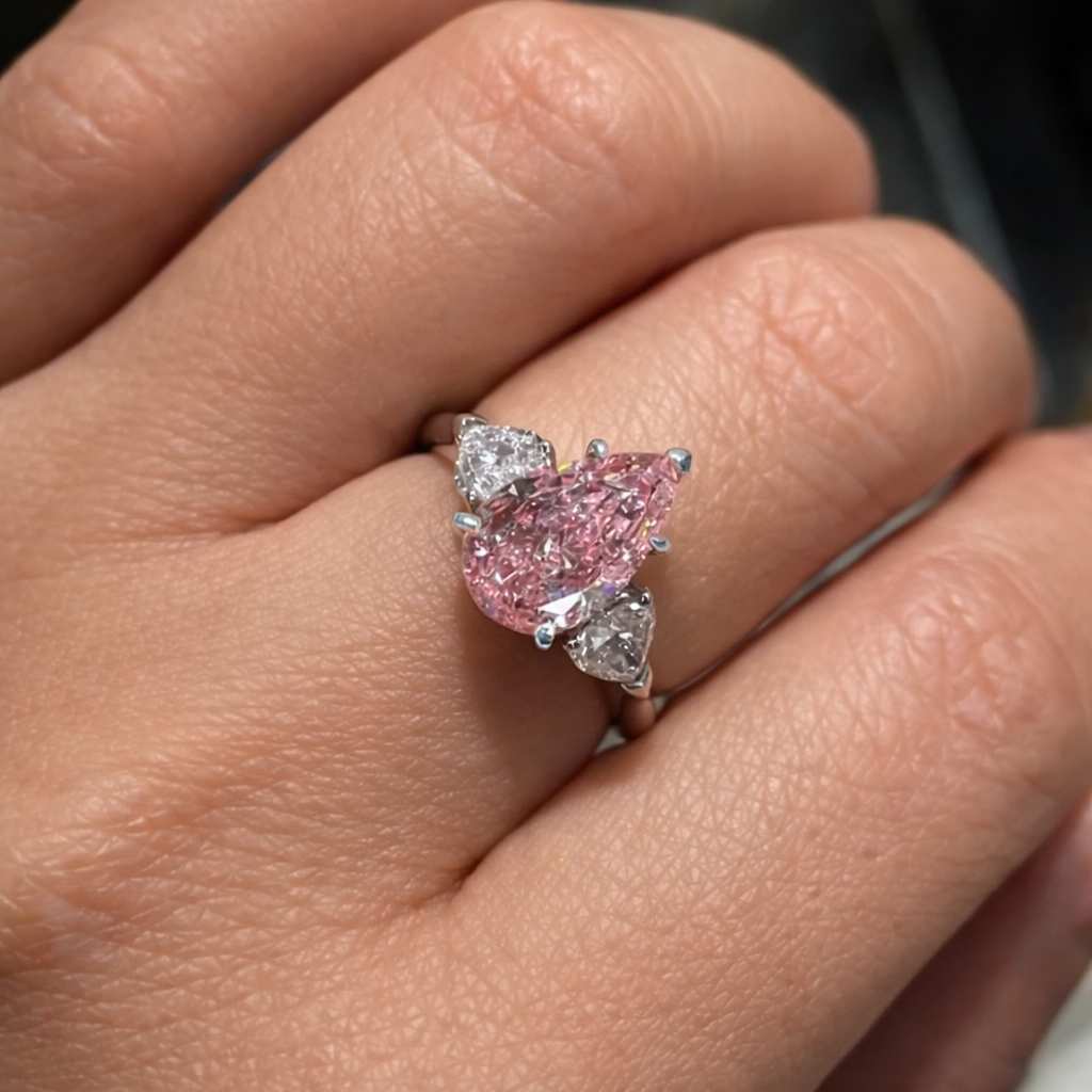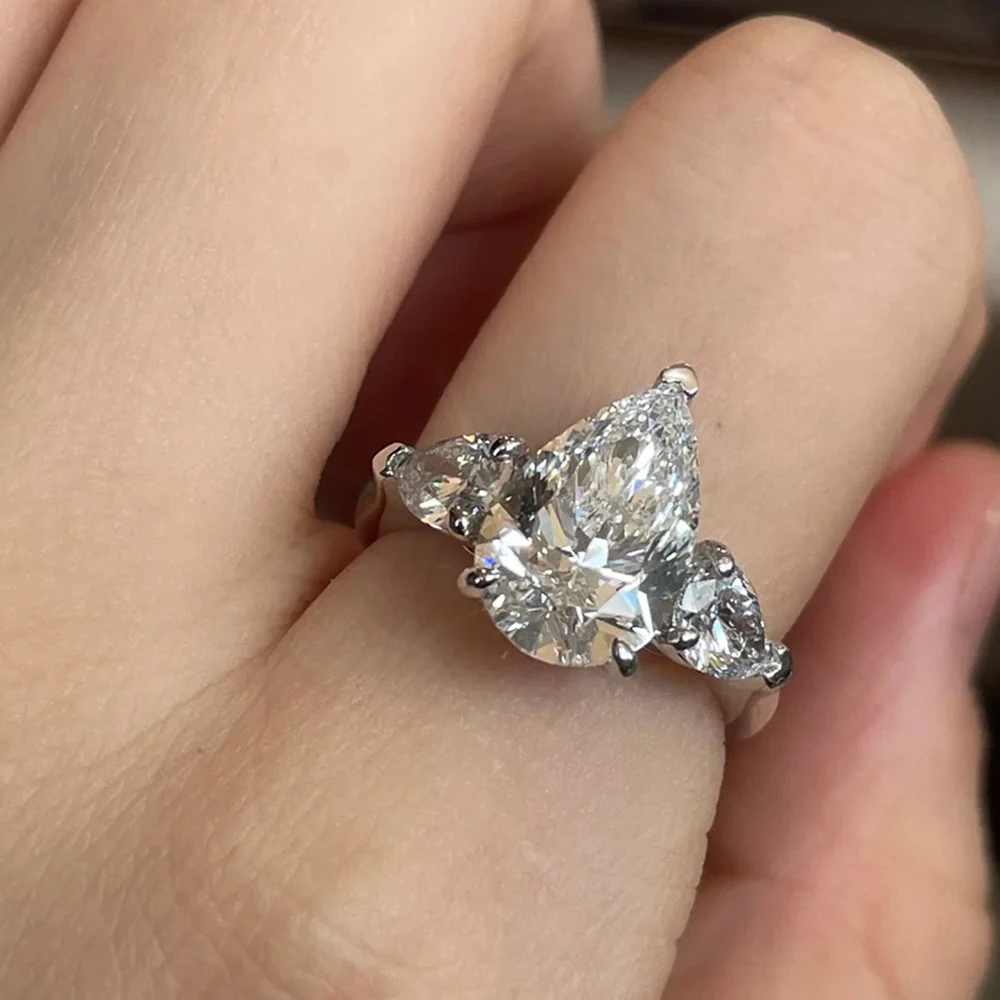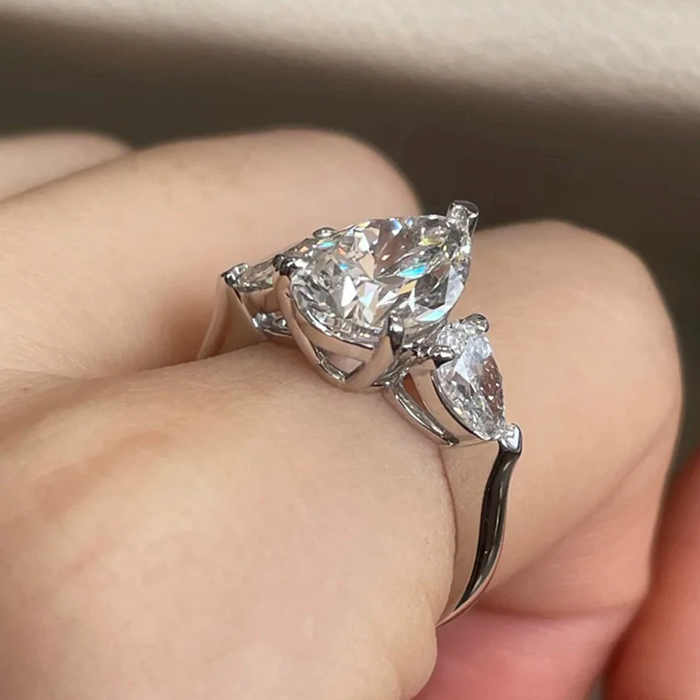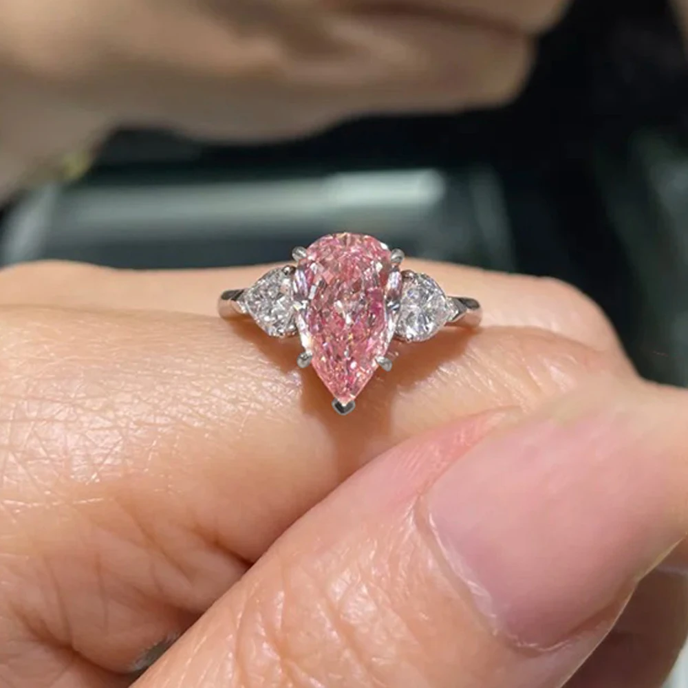 MUXIFC Pear Cut Moissanite Ring for Women Pink 3 Stone D Color Lab Diamond Wedding Band S925 Sterling Silver Fine Jewelry Gift