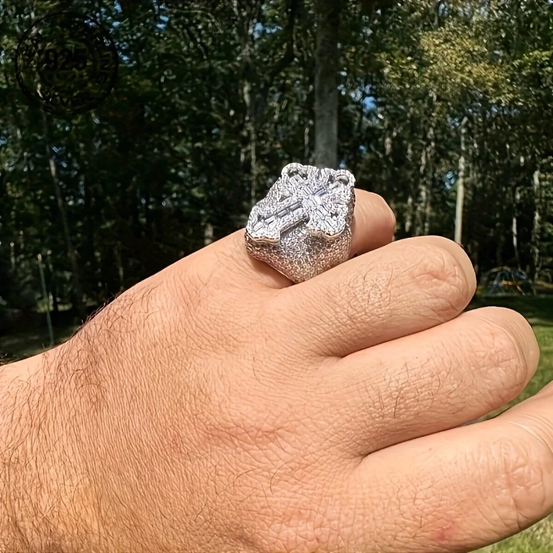 Fashion Design Brilliant 925 Silver Cross Rings For Men Shiny Zircon Inlay Iced Out Hip Hop Ring Vintage Rapper Jewelry