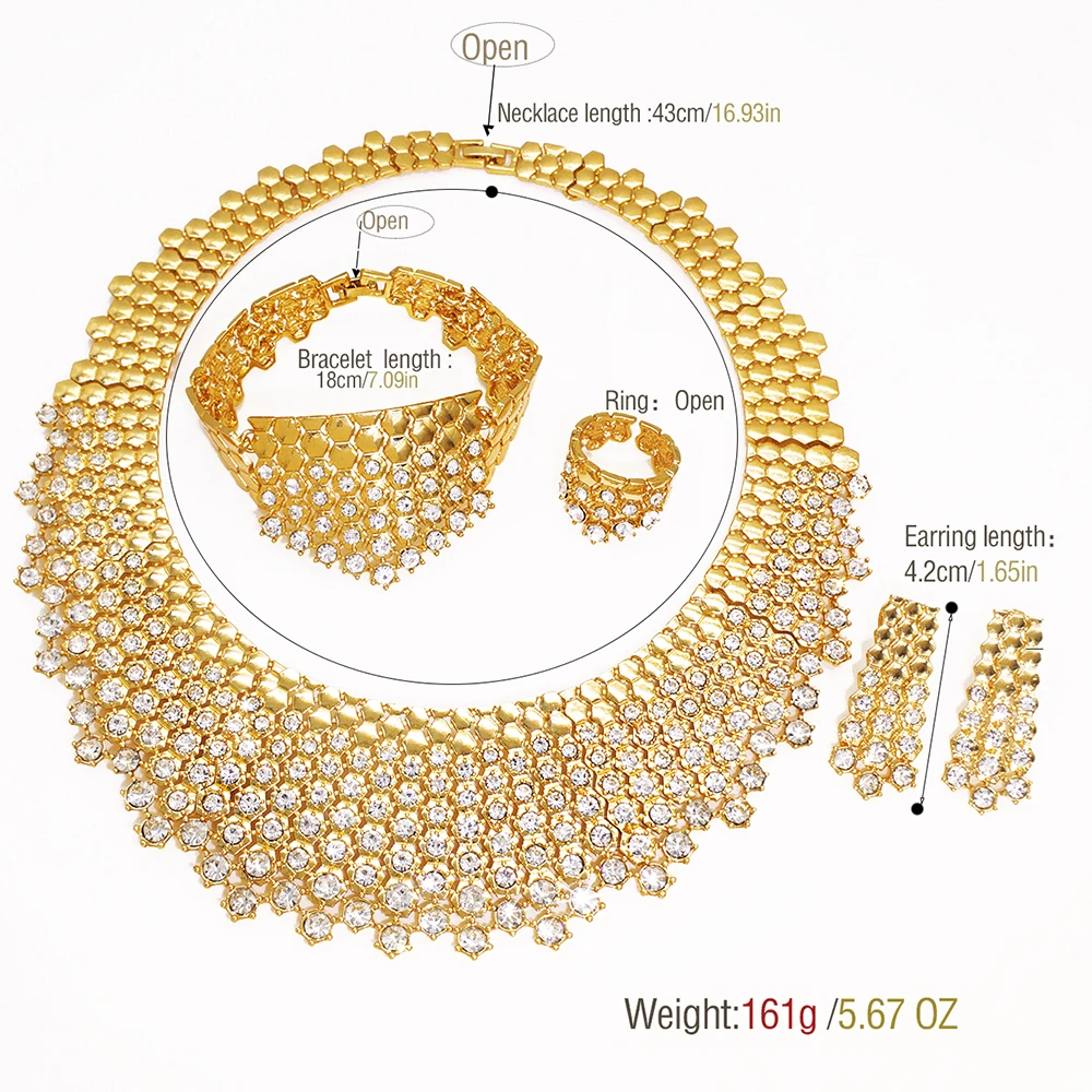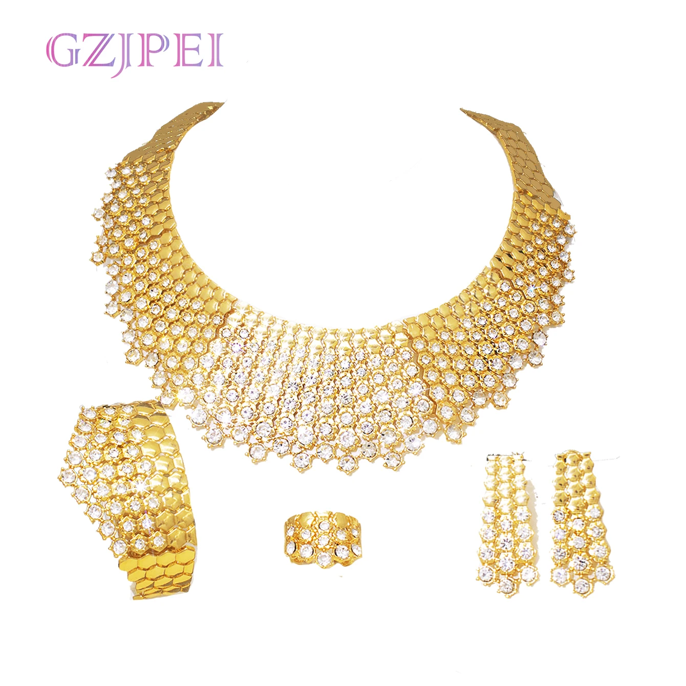 GZJPEI Shiny White Zircon Jewelry Set Italy Nigeria Wedding Jewellery 18K Gold Plated Big Necklace Bracelet Long Drop Earring