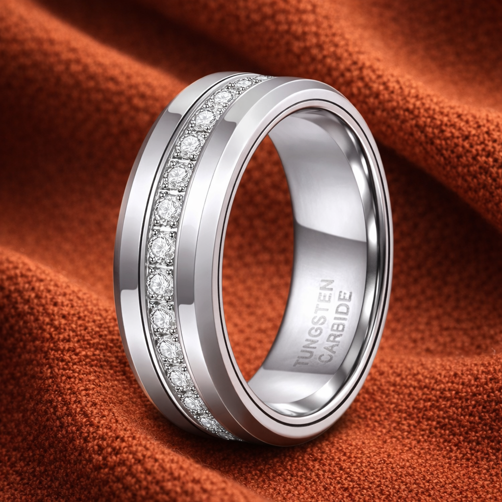 8mm Mens Tungsten Wedding Bands with Cubic Zirconia Trendy Eternity Ring Unisex CZ Inlaid High Polish Size 7-13